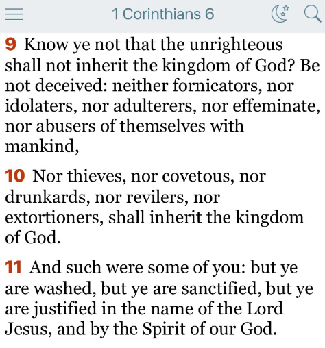 9 あなたがたは知らないのですか。不義な者は神の国を受け継げません。思い違いをしてはいけません。不品行な者、偶像を拝む者、姦淫する者、男色にふける者、男色にふける者、