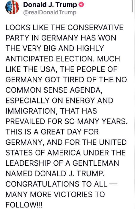 ドイツの保守党が、非常に大規模で非常に期待されていた選挙に勝利したようです。米国と同様に、ドイツの人々は、特にエネルギーと移民に関する、長年にわたり優勢であった常識に反する政策にうんざりしていました。
