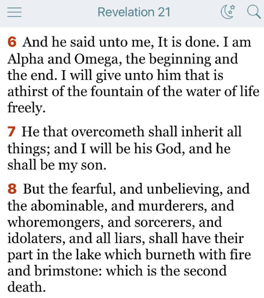 8 しかし、臆病な者、不信仰な者、忌まわしい者、人殺し、淫行を行う者、魔術を行う者、偶像を拝む者、すべて偽りを言う者は、火と硫黄の燃える池に投げ込まれ、これが第二の死である。