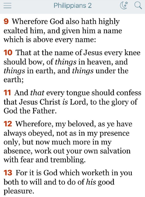 10節 それは、イエスの御名によって、天にあるもの、地にあるもの、地の下にあるもののすべてがひざまずき、
