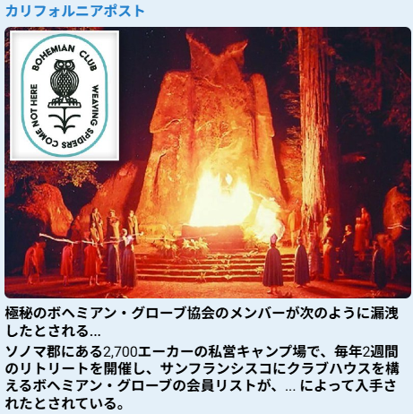 カリフォルニアのワイン産地に拠点を置く極秘エリート男性クラブのメンバーの一部が漏洩されたとされ、名前には元深夜番組司会者のコナン・オブライエン、大富豪の元ニューヨーク市長マイケル・ブルームバーグ、元グーグルCEOのエリック・シュミットなどが含まれる。サンフランシスコ・スタンダード紙によると、ソノマ郡にある2,700エーカーの私営キャンプ場、ボヘミアン・グローブの会員リストは、独立系ジャーナリストによって入手され、クラブ会員によって確認されたという。同キャンプ場は毎年2週間のリトリートを開催し、サンフランシスコにクラブハウスがある。