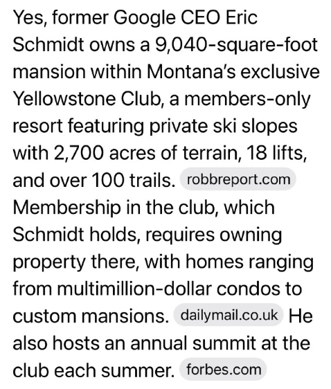 はい、元Google CEOのエリック・シュミット氏は、モンタナ州の高級リゾート、イエローストーン・クラブ内に9,040平方フィートの邸宅を所有しています。イエローストーン・クラブは会員制リゾートで、2,700エーカーの敷地にプライベートスキー場、18基のリフト、100以上のコースを備えています。robbreport.com
