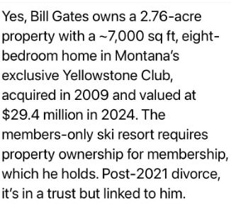 はい、ビル・ゲイツはモンタナ州の高級リゾート、イエローストーン・クラブに2.76エーカーの土地を所有しており、約7,000平方フィート、8ベッドルームの邸宅を所有しています。この土地は2009年に取得され、2024年には2,940万ドルの価値があるとされています。この会員制スキーリゾートの会員資格を得るには、土地の所有権が必要ですが、彼はそれを保有しています。2021年の離婚後、この土地は信託財産となっていますが、彼と結びついています。
