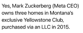 モンタナ州の高級リゾート地イエローストーン・クラブに3軒の家を所有しています。