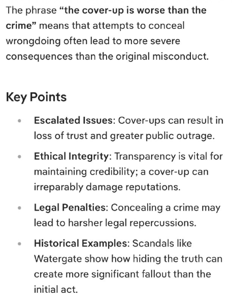 隠蔽:教会が虐待の申し立てに適切に対処しなかった、あるいは評判を守るために隠蔽しようとしたとして非難されるケースもあります。「隠蔽は犯罪よりも悪い」という表現は、不正行為を隠蔽しようとする試みが、元の不正行為よりも深刻な結果につながることが多いことを意味します。