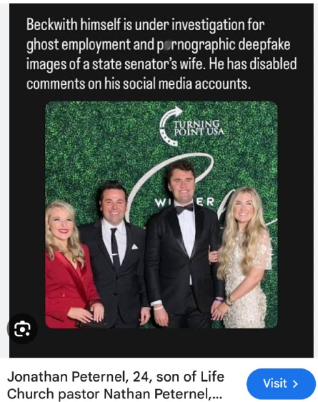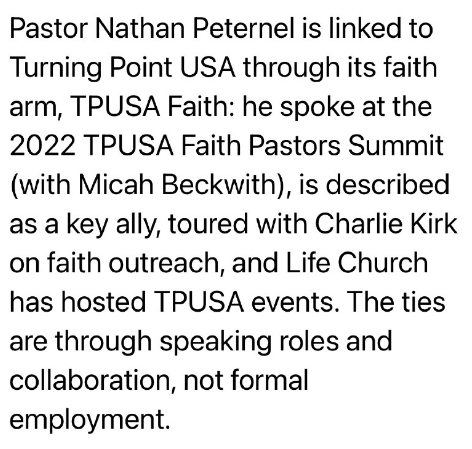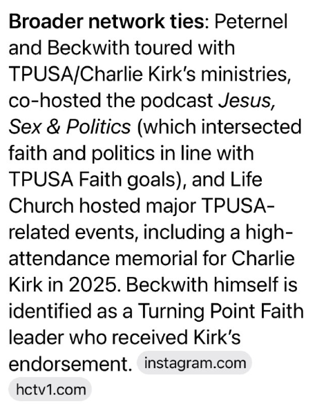 より広範なネットワークとのつながり:ピーターネル氏とベックウィズ氏は、TPUSA/チャーリー・カーク氏のミニストリーに同行し、ポッドキャスト「Jesus, Sex & Politics」(TPUSAの信仰目標に沿って、信仰と政治を融合させた番組)の共同司会を務めました。また、ライフ教会は、2025年に多くの参加者を集めたチャーリー・カーク氏の追悼式を含む、TPUSA関連の主要イベントを主催しました。ベックウィズ氏自身も、カーク氏の推薦を受けたターニングポイント・フェイスのリーダーとして知られています。