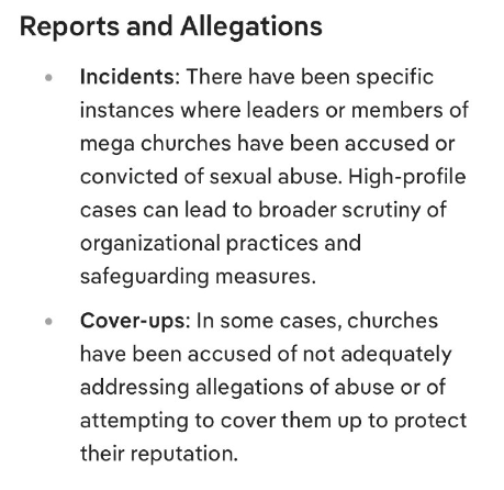 事件:大規模教会の指導者や信徒が性的虐待で告発されたり、有罪判決を受けたりした事例がいくつかありました。注目を集める事件は、組織の慣行や安全対策に対するより広範な精査につながる可能性があります。