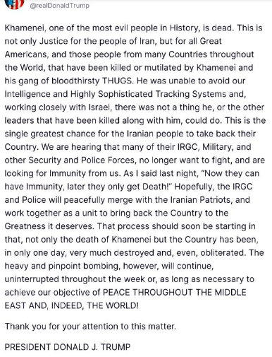 歴史上最も邪悪な人物の一人、ハメネイ師が亡くなりました。これはイラン国民にとっての正義であるだけでなく、すべての偉大なアメリカ国民、そして世界中の多くの国々の人々にとっての正義でもあります。彼らはハメネイ師とその血に飢えた凶悪犯集団によって殺害されたり、傷つけられたりしました。彼は我が国の諜報機関と高度な追跡システムから逃れることはできず、イスラエルと緊密に協力していたため、彼自身、そして彼と共に殺害された他の指導者たちには、何もできませんでした。これはイラン国民にとって、祖国を取り戻すための最大のチャンスです。多くのIRGC、軍隊、そしてその他の治安部隊や警察部隊がもはや戦うことを望まず、我々に免責を求めていると聞いています。