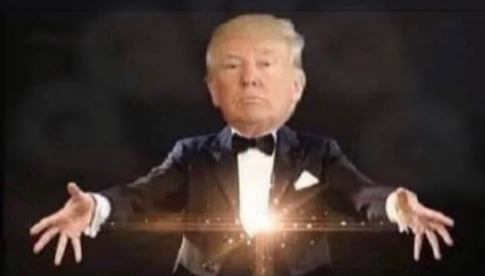 - マジシャンのトランプ氏: 画像内のテキスト「AND FOR MY NEXT TRICK(さて、次の手品は)」は、マジックの定番のセリフです。