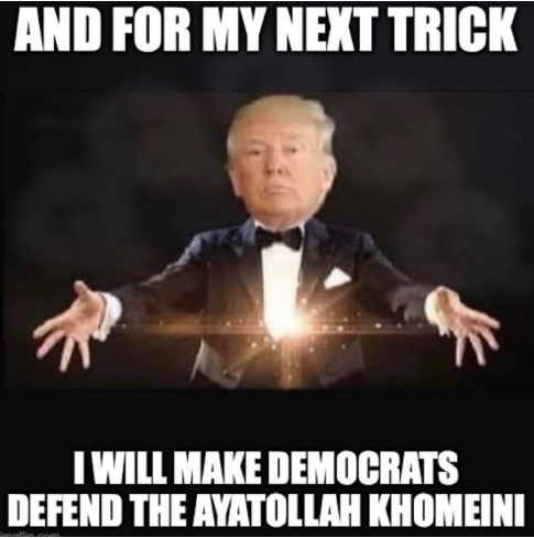 - 民主党への皮肉: 「I WILL MAKE DEMOCRATS DEFEND THE AYATOLLAH KHOMEINI(民主党にアヤトラ・ホメイニを擁護させてみせよう)」という一文は、トランプ氏がイランに対して攻撃的な行動をとるたびに、民主党が「戦争の危機だ」と批判することを、「独裁者やテロリストを擁護している」ように見せかけるトランプ支持者側の視点を表しています。