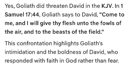 はい、欽定訳聖書ではゴリアテがダビデを脅迫しました。サムエル記上17章44節で、ゴリアテはダビデにこう言います。「私のところに来なさい。お前の肉を空の鳥や野の獣に与えよう。」