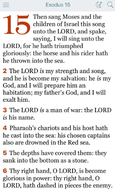 そこでモーセとイスラエルの人々は、主にこの歌を歌い、言った。「わたしは主に歌おう。主は栄光のうちに勝利を収められた。馬と乗り手を海に投げ込まれた。