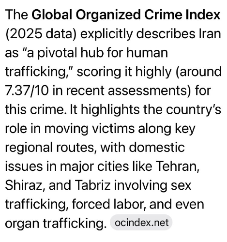 世界組織犯罪指数(2025年データ)は、イランを「人身売買の重要な拠点」と明確に位置づけ、この犯罪に関して高い評価(最近の評価では10点満点中7.37点)を与えています。この指数は、イランが主要な地域ルートを経由して被害者を移動させる役割を強調しており、テヘラン、シーラーズ、タブリーズなどの主要都市では、性的人身売買、強制労働、さらには臓器売買といった国内問題が蔓延しています。ocindex.net