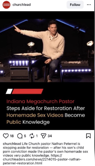 ネイサン・ピーターネルインディアナ州ペンドルトンに拠点を置く複数キャンパスのライフ教会の主任牧師である彼は、 「組織的な修復プロセス」を受けるために指導者としての役割を退いた。