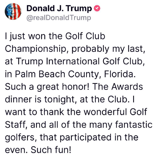 フロリダ州パームビーチ郡のトランプ・インターナショナル・ゴルフクラブで、おそらく最後になるゴルフクラブ選手権に優勝しました。