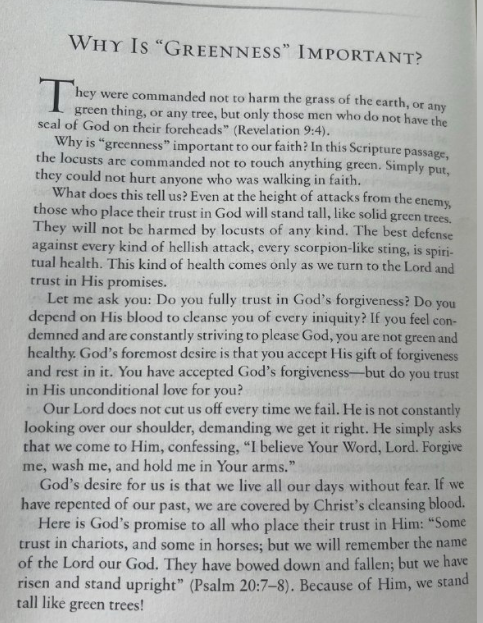 彼らは地の草や、緑の植物、木々を傷つけてはならないと命じられ、額に神の鱗のない者だけを害するように命じられた(黙示録9:4)。なぜ「緑」が私たちの信仰にとって重要なのでしょうか?この聖句では、イナゴは緑の植物に触れてはならないと命じられています。簡単に言えば、信仰をもって歩む者を傷つけることはできないということです。これは私たちに何を教えているのでしょうか?敵の攻撃が最高潮に達した時でさえ、神に信頼を置く者は、堅固な緑の木のように高くそびえ立つでしょう。彼らはどんな種類のイナゴにも害されることはありません。あらゆる種類の地獄の攻撃、あらゆるサソリの毒針のような攻撃に対する最良の防御策は、霊的な健康です。このような健康は、私たちが主に向き、主の約束を信頼することによってのみ得られます。あなたに尋ねます。あなたは神の赦しを完全に信頼していますか?あなたは、あらゆる罪からあなたを清めるために、神の血に頼っていますか?罪悪感?もしあなたが罪悪感を感じ、絶えず神を喜ばせようと努力しているなら、あなたは健全で健康な状態ではありません。神の最も大切な願いは、あなたが神の赦しの賜物を受け入れ、その中で安らぎを得ることです。あなたは神の赦しを受け入れましたが、神の無条件の愛を信じていますか?
