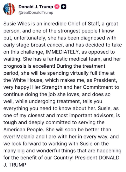 スージー・ワイルズは素晴らしい首席補佐官であり、素晴らしい人物で、私が知る中でも最も強い人の一人です。しかし残念ながら、彼女は初期の乳がんと診断され、待つのではなく、すぐにこの困難に立ち向かうことを決意しました。彼女には優秀な医療チームがおり、予後は良好です。治療期間中、彼女はほぼフルタイムでホワイトハウスに滞在する予定です。大統領として、私は大変嬉しく思っています。治療を受けながらも、愛する仕事を続け、そして見事に職務を遂行しようとする彼女の強さと献身は、彼女の人となりを雄弁に物語っています。スージーは、私の最も親しい、そして最も重要なアドバイザーの一人として、タフで、アメリカ国民への奉仕に深く献身しています。彼女はすぐに以前よりも元気になるでしょう。メラニアと私はあらゆる面で彼女を支持しており、