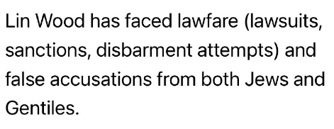 リン・ウッドは、ユダヤ人と非ユダヤ人の両方から、訴訟(訴訟、制裁、弁護士資格剥奪の試み)や虚偽の告発といった法的闘争に直面してきた。