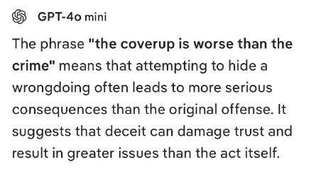 「隠蔽は犯罪よりも悪い」という表現は、不正行為を隠蔽しようとすると、元の犯罪よりも深刻な結果を招くことが多いという意味です。つまり、欺瞞は信頼を損ない、行為そのものよりも大きな問題を引き起こす可能性があることを示唆しています。
