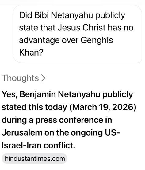 はい、イスラエルのベンヤミン・ネタニヤフ首相は、2026年3月の演説(または記者会見)において、**「イエス・キリストはチンギス・ハンに対して何の優位性も持たない」**という趣旨の発言を公に行いました。