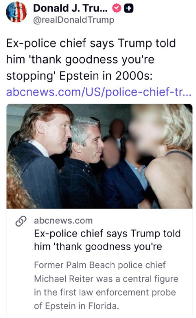 元警察署長が、トランプ氏が「君がエプスタインを止めてくれて本当に良かった」と言ったと証言