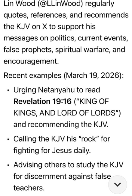 リン・ウッド(@LLinWood)は、政治、時事問題、偽預言者、霊的戦い、そして励ましに関する自身のメッセージを裏付けるために、定期的にKJV(欽定訳聖書)を引用、参照、推奨しています。
