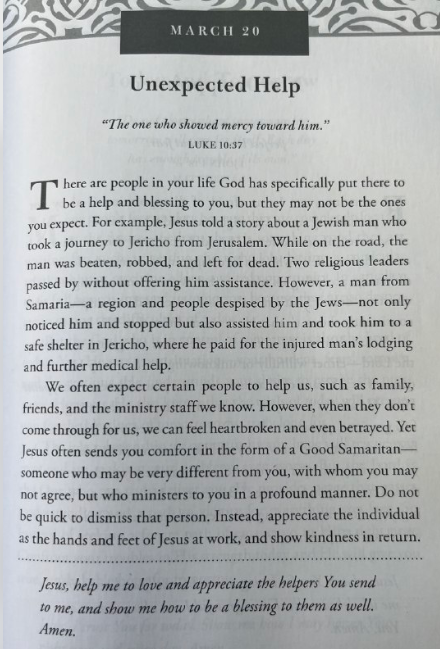 あなたの人生には、神があなたを助け、祝福するために特別に遣わされた人々がいます。しかし、それはあなたが期待する人ではないかもしれません。例えば、イエスはエルサレムからエリコへ旅をしたユダヤ人の男性の話をしました。その男性は道中で殴られ、強盗に遭い、死にかけていました。二人の宗教指導者は通り過ぎましたが、助けようとはしませんでした。しかし、ユダヤ人から軽蔑されていたサマリア地方出身の男性が、彼に気づいて立ち止まっただけでなく、エリコの安全な宿に連れて行き、宿泊費と医療費を支払いました。私たちは、家族、友人、知り合いの教会のスタッフなど、特定の人が助けてくれることを期待しがちです。しかし、彼らが期待に応えてくれなかった時、私たちは心を痛め、裏切られたと感じることさえあります。しかし、イエスはしばしば、良きサマリア人という形で慰めを送ってくださいます。それは、あなたとは全く異なる人、意見が合わない人かもしれませんが、あなたに深い恵みを与えてくれる人です。そのような人を軽んじてはいけません。むしろ、その人をイエスの働き手足として感謝し、親切に返してください。