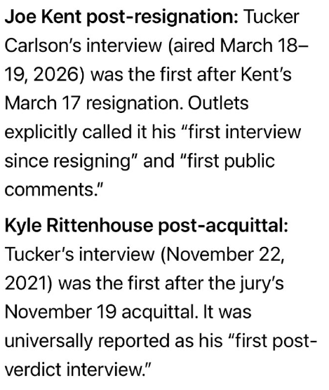 ジョー・ケント氏の辞任後:タッカー・カールソン氏のインタビュー(2026年3月18日~19日放送)は、ケント氏が3月17日に辞任した後、初めてのインタビューでした。各メディアは、これを「辞任後初のインタビュー」「初の公式コメント」と明言しました。