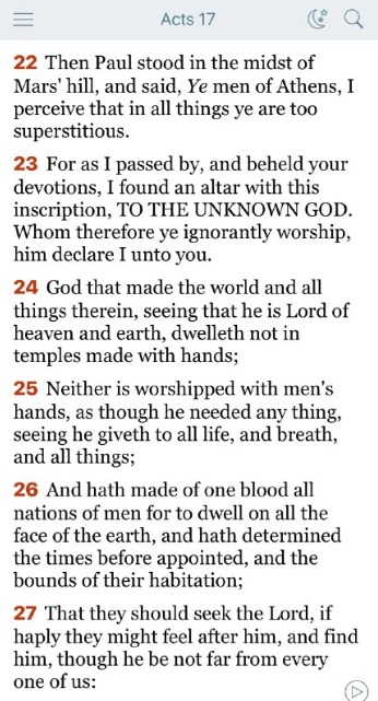 パウロはアレオパゴスの丘の真ん中に立って言った。「アテネの人々よ、わたしはあなたがたがすべてのことにおいて、あまりにも迷信深いことを知りました。