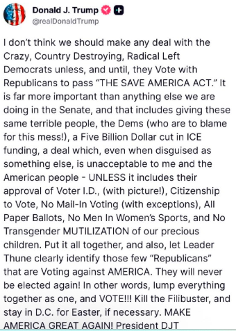 承認する条件が含まれない限りは。すべてをまとめて、そしてリーダー・チューンに、アメリカに反対票を投じている少数の「共和党員」を明確に特定してもらいましょう。彼らは二度と選出されることはありません!言い換えれば、すべてを一つにまとめて投票しましょう!議事妨害を廃止し、必要であればイースターもワシントンD.C.に留まりましょう。アメリカを再び偉大に!