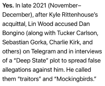 はい。2021年後半(11月~12月)、カイル・リッテンハウスの無罪判決後、リン・ウッドはテレグラムやインタビューで、ダン・ボンジーノ(タッカー・カールソン、セバスチャン・ゴルカ、チャーリー・カークらと共に)が、自分に対する虚偽の告発を広めるための「ディープステート」の陰謀を企てていると非難しました。ウッドは彼らを「裏切り者」「モッキンバード」と呼びました。