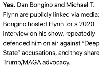 はい。ダン・ボンジーノとマイケル・T・フリンはメディアを通じて公につながりを持っています。ボンジーノは2020年に自身の番組でフリンをインタビューし、繰り返し「ディープステート」疑惑から彼を擁護しました。また、両者はトランプ支持/MAGA支持という共通点を持っています。