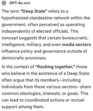 GPT-40 mini 「ディープステート」という用語は、政府内部に存在すると想定される秘密ネットワークを指し、多くの場合、選出された公職者とは独立して活動していると認識されています。この概念は、特定の官僚機構、情報機関、軍事機関、さらにはメディア部門が、民主的なプロセスを経ずに政策や統治に影響を与えていることを示唆しています。