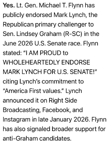 、リンチ氏の「アメリカ・ファースト」の価値観へのコミットメントを理由に挙げました。リンチ氏は2026年1月下旬に、Right Side Broadcasting、Facebook、Instagramでこのことを発表しています。フリン中将はグラハム氏に反対する候補者への幅広い支持も示唆しています。
