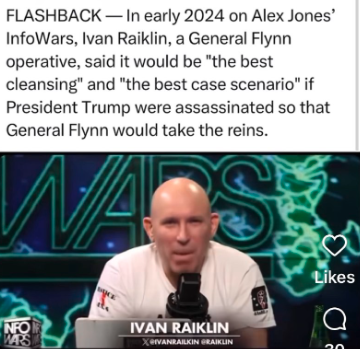 フラッシュバック―2024年初頭、アレックス・ジョーンズの番組「インフォウォーズ」で、フリン将軍の工作員であるイヴァン・ライクリンが、トランプ大統領が暗殺されればフリン将軍が政権を掌握できるだろうと述べ、「最高の浄化」であり「最良のシナリオ」だと発言した。