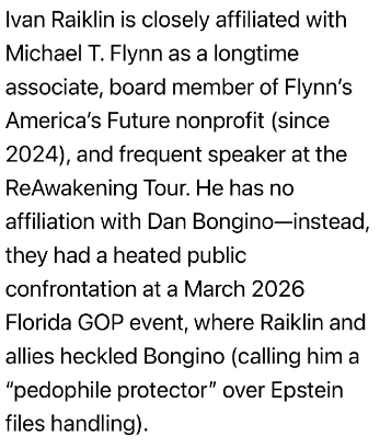イヴァン・ライクリンは、長年の協力者としてマイケル・T・フリンと密接な関係にあり、フリンの非営利団体「アメリカズ・フューチャー」(2024年より)の理事を務め、リウェイクニング・ツアーの講演者としても頻繁に登壇している。一方、ダン・ボンジーノとは一切関係がなく、2026年3月にフロリダ州共和党のイベントで激しい口論を繰り広げた。ライクリンと彼の支持者たちは、ボンジーノに対し、エプスタイン事件のファイル処理を巡って「小児性愛者の擁護者」だと罵倒した。