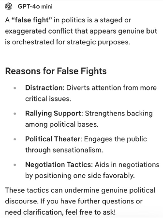 政治における「偽りの争い」とは、演出された、あるいは誇張された対立であり、一見本物のように見えるが、