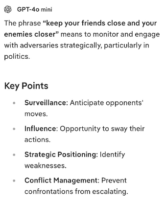 「友は近くに、敵はもっと近くに」という諺は、特に政治において、敵対者を戦略的に監視し、関与することを意味します。
