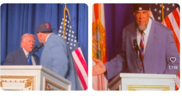 この画像は、ドナルド・トランプ氏と元プロ野球選手のデビッド・オルティス氏が演台に立っている様子です。