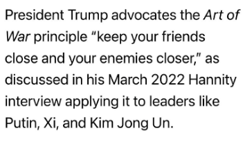 「友は近くに、敵はもっと近くに」という孫子の兵法の原則を提唱しており、