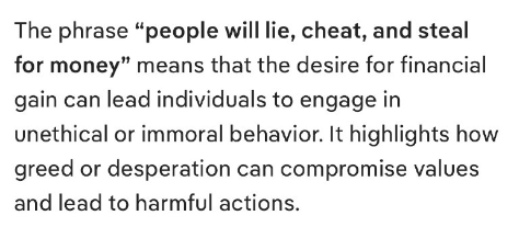 「人は金のために嘘をつき、騙し、盗む」という表現は、金銭的な利益への欲求が、個人を非倫理的または不道徳な行為に走らせる可能性があることを意味します。これは、貪欲さや絶望感が価値観を損ない、有害な行動につながる可能性を浮き彫りにしています。