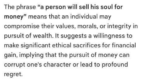 「人は金のために魂を売る」という表現は、人が富を追求する過程で、自分の価値観、道徳観、あるいは誠実さを妥協する可能性があることを意味します。これは、金銭的利益のために重大な倫理的犠牲を払うことを厭わない姿勢を示しており、金銭の追求が人格を堕落させたり、深い後悔につながったりする可能性を示唆しています。