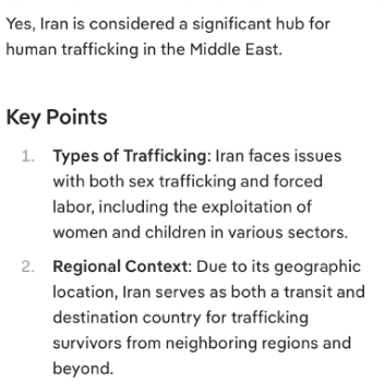 様々な分野における女性や子供の搾取も含まれます。 - 地域的背景:地理的な位置関係から、イランは近隣地域やそれ以外の地域からの人身売買被害者にとって、通過国であると同時に目的地国でもあります。