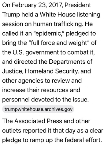 2017年2月23日、トランプ大統領はホワイトハウスで人身売買に関する意見聴取会を開催しました。大統領は人身売買を「蔓延」と呼び、米国政府の「全力を尽くして」撲滅に取り組むと約束し、司法省、国土安全保障省、その他の関係機関に対し、この問題に投入する資源と人員の見直しと増強を指示しました。