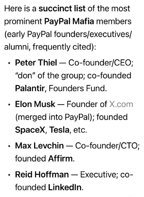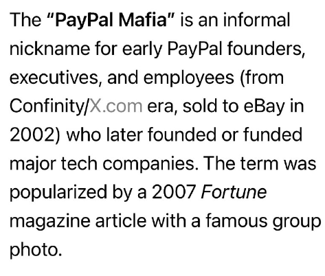 「PayPalマフィア」とは、PayPalの初期の創業者、幹部、従業員(Confinity/X.com時代、2002年にeBayに売却)を指す非公式のニックネームで、後に大手テクノロジー企業を設立または出資した人々を指す。