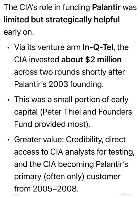 CIAは、ベンチャーキャピタル部門であるIn-Q-Telを通じて、パランティアが2003年に設立されて間もなく、2回の資金調達ラウンドで約200万ドルを投資した。