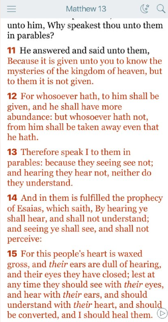 それは、彼らが目で見て、耳で聞き、心で理解し、悔い改めて、わたしが彼らを癒すことがないようにするためである。