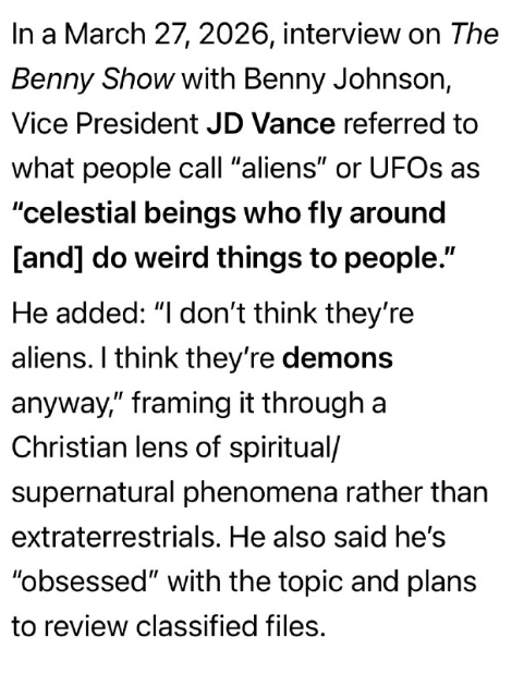 2026年3月27日、ベニー・ジョンソン司会の「ザ・ベニー・ショー」に出演した際、JD・ヴァンス副大統領は、人々が「宇宙人」やUFOと呼ぶものを「飛び回って人々に奇妙なことをする天界の存在」と表現した。