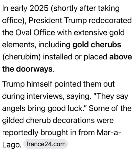 2025年初頭(就任直後)、トランプ大統領はホワイトハウスのオーバルオフィスを改装し、金色の装飾をふんだんに取り入れた。出入り口の上には金色のケルビム(天使像)が設置され、トランプ氏自身もインタビューで「天使は幸運をもたらすと言われている」と述べ、ケルビムを指さした。金色のケルビムの装飾品の一部は、マール・ア・ラゴから持ち込まれたと報じられている。france24.com
