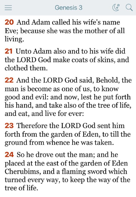 今、彼が手を伸ばして、命の木の実を取って、食べて、永遠に生きることがないように。」